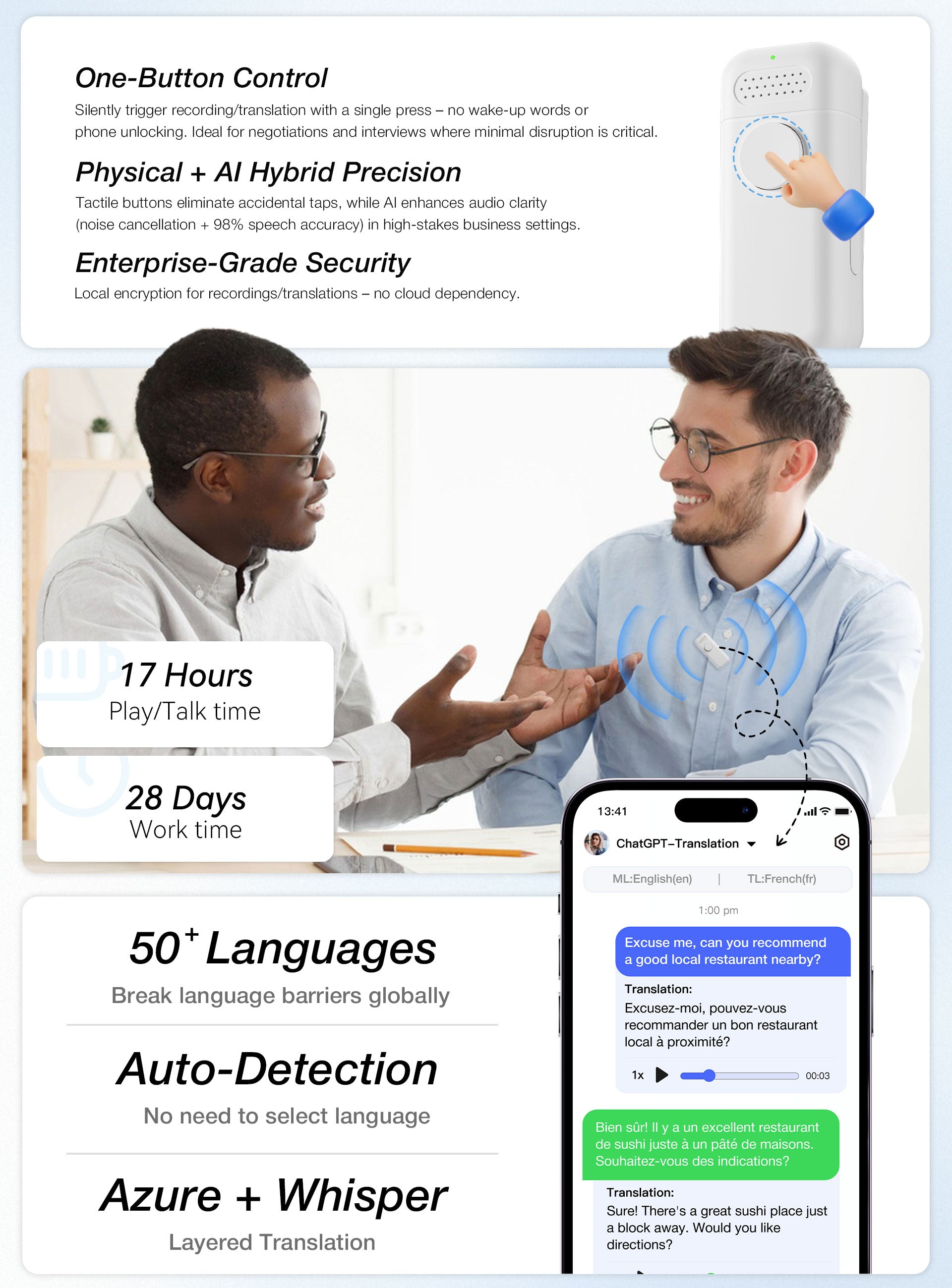 No complicated setup. Just clip it on, push to record, and speak naturally. Its ergonomic one-click design means no wake words, no menu diving—just instant voice capture.